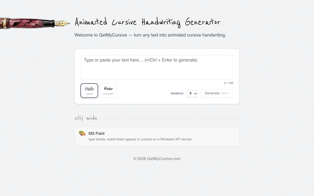 Welcome to GetMyCursive, the innovative online tool that transforms ordinary text into captivating animated cursive handwriting. Forget static fonts and predictable presentations – GetMyCursive breathes life into your words, creating visually stunning animations that capture attention and leave a lasting impression.